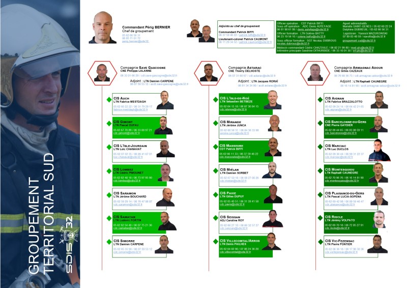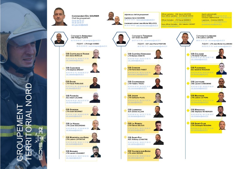 Le SDIS du Gers regroupe 43 centres d’incendie et de secours organisés en 2 groupements territoriaux et 6 compagnies.