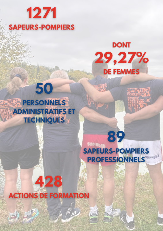 Le SDIS 32 compte plus de 1250 sapeurs-pompiers. Plus de 93% d’entre eux sont volontaires. Il compte également des personnels administratifs et techniques indispensables au fonctionnement de la structure.